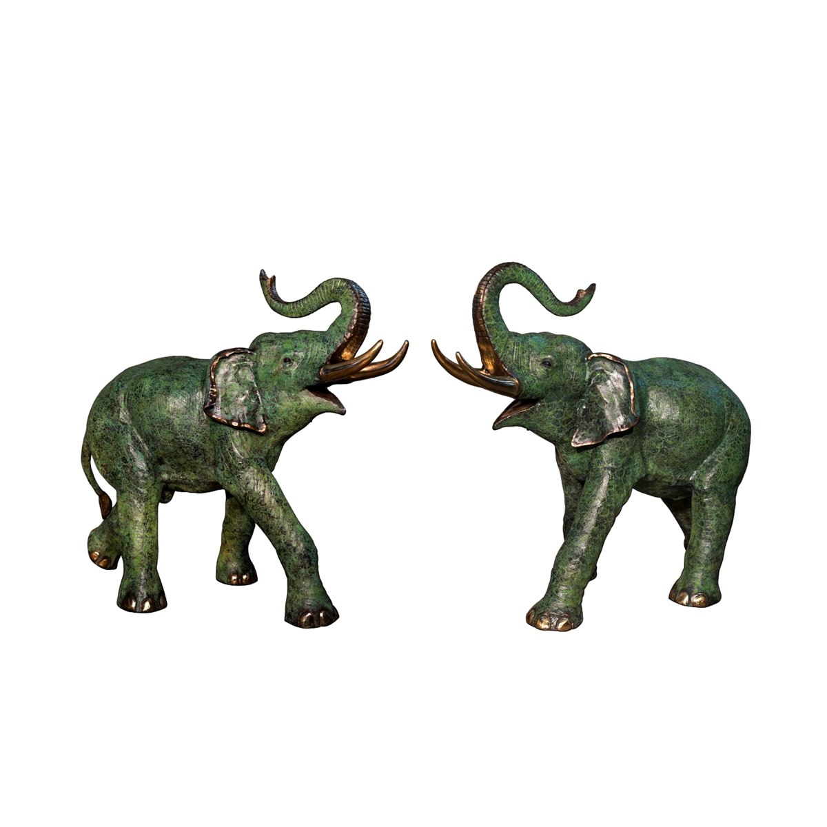 Bronze Elephant Sculpture Pair by Metropolitan Galleries was cast by the traditional, Lost Wax Bronze Casting method. This labor intensive and time consuming method of casting bronze statues, ensure pristine quality and vivid detail. Metropolitan Galleries Inc. Offers a large selection of bronze statues and bronze fountains perfect for indoor and outdoor use. This Bronze Elephant Sculpture Pair features intricate, hand forged details with a beautiful green color epoxy finish. We proudly ship to all fifty states, as well as international shipping.
