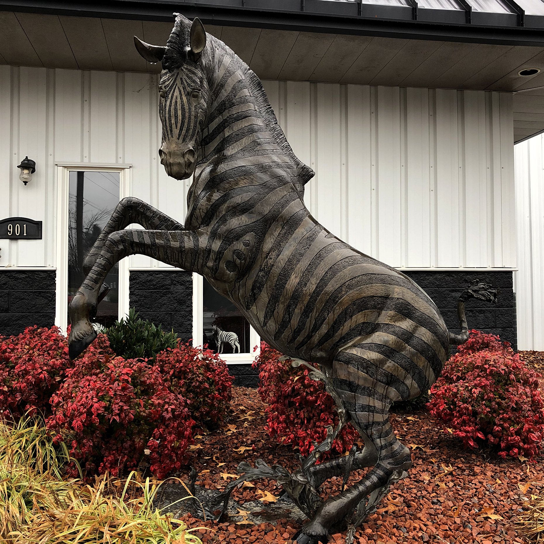 Our bronze sculpture and fountain selection may also be customized in a number of fire-applied patinas, such as classic French Brown, Verdigris, Italian Green as well as other custom finish options. All bronze statuary will develop a natural patina when left in natures elements. The aged patina on bronzes is often desired, but can be prevented by care and cleaning of the bronze statue by applying beeswax or other polish to prevent a patina from forming. Click here to view our Bronze Sculpture and Fountain Care and Cleaning Guide. Should you have questions about this Bronze Rearing Zebra Sculpture, please reach out to our corporate office and warehouse. 1-800-929-1681.