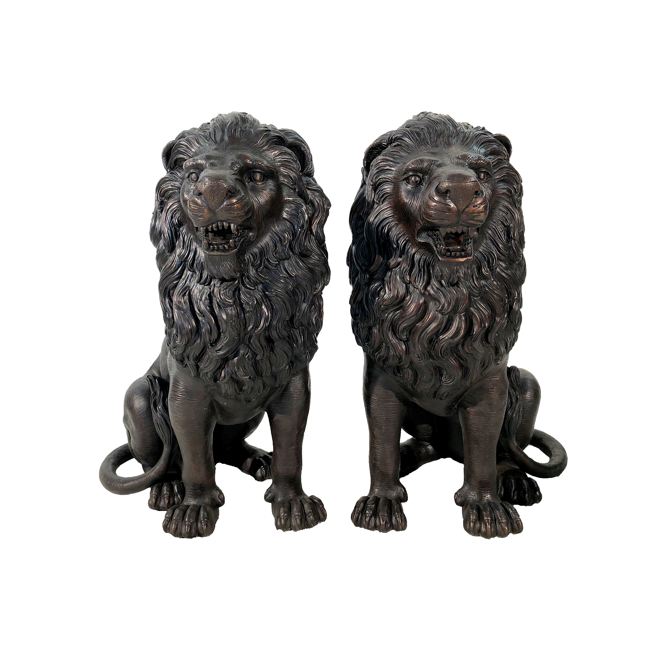 Our bronze sculpture selection may also be customized in a number of fire-applied patinas, such as classic French Brown, Verdigris, Italian Green as well as other custom finish options. All bronze statuary will develop a natural patina when left in natures elements. The aged patina on bronzes is often desired, but can be prevented by care and cleaning of the bronze statue by applying beeswax or other polish to prevent a patina from forming. Click here to view our Bronze Sculpture and Fountain Care and Cleaning Guide. Should you have questions about this Bronze Sitting Snarling Lions Sculpture Pair, please reach out to our corporate office and warehouse. 1-800-929-1681.