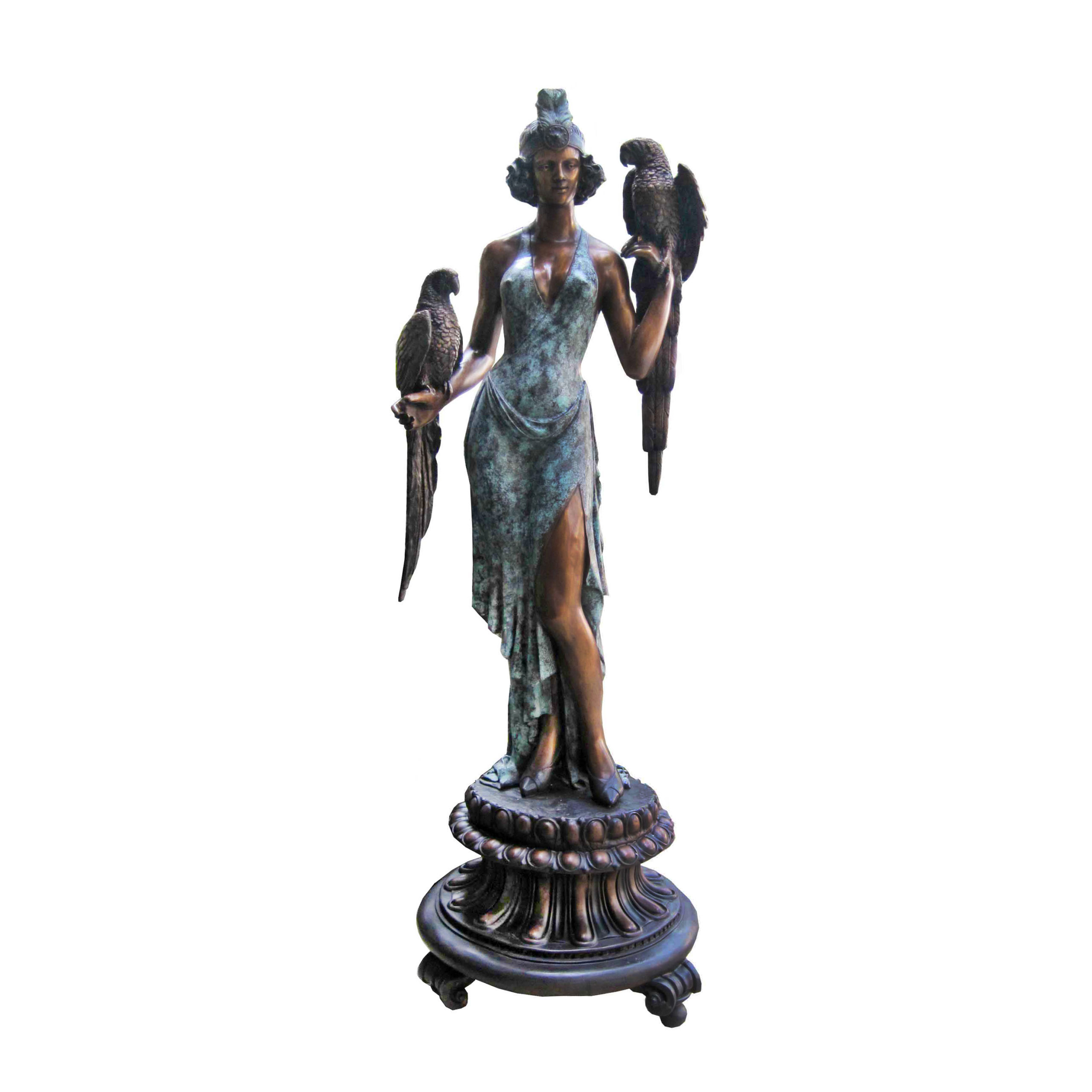 Our bronze sculpture selection may also be customized in a number of fire-applied patinas, such as classic French Brown, Verdigris, Italian Green as well as other custom finish options. All bronze statuary will develop a natural patina when left in natures elements. The aged patina on bronzes is often desired, but can be prevented by care and cleaning of the bronze statue by applying beeswax or other polish to prevent a patina from forming. Click here to view our Bronze Sculpture and Fountain Care and Cleaning Guide. Should you have questions about this Bronze Lady with Two Parrots Sculpture, please reach out to our corporate office and warehouse. 1-800-929-1681.