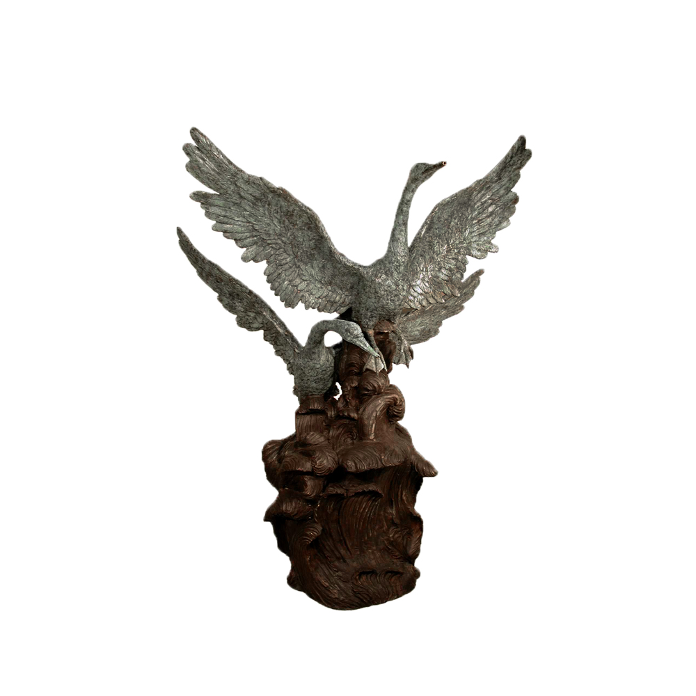 Our bronze sculpture selection may also be customized in a number of fire-applied patinas, such as classic French Brown, Verdigris, Italian Green as well as other custom finish options. All bronze statuary will develop a natural patina when left in natures elements. The aged patina on bronzes is often desired, but can be prevented by care and cleaning of the bronze statue by applying beeswax or other polish to prevent a patina from forming. Click here to view our Bronze Sculpture and Fountain Care and Cleaning Guide. Should you have questions about this Bronze Two Swans on Rock Fountain Sculpture, please reach out to our corporate office and warehouse. 1-800-929-1681.