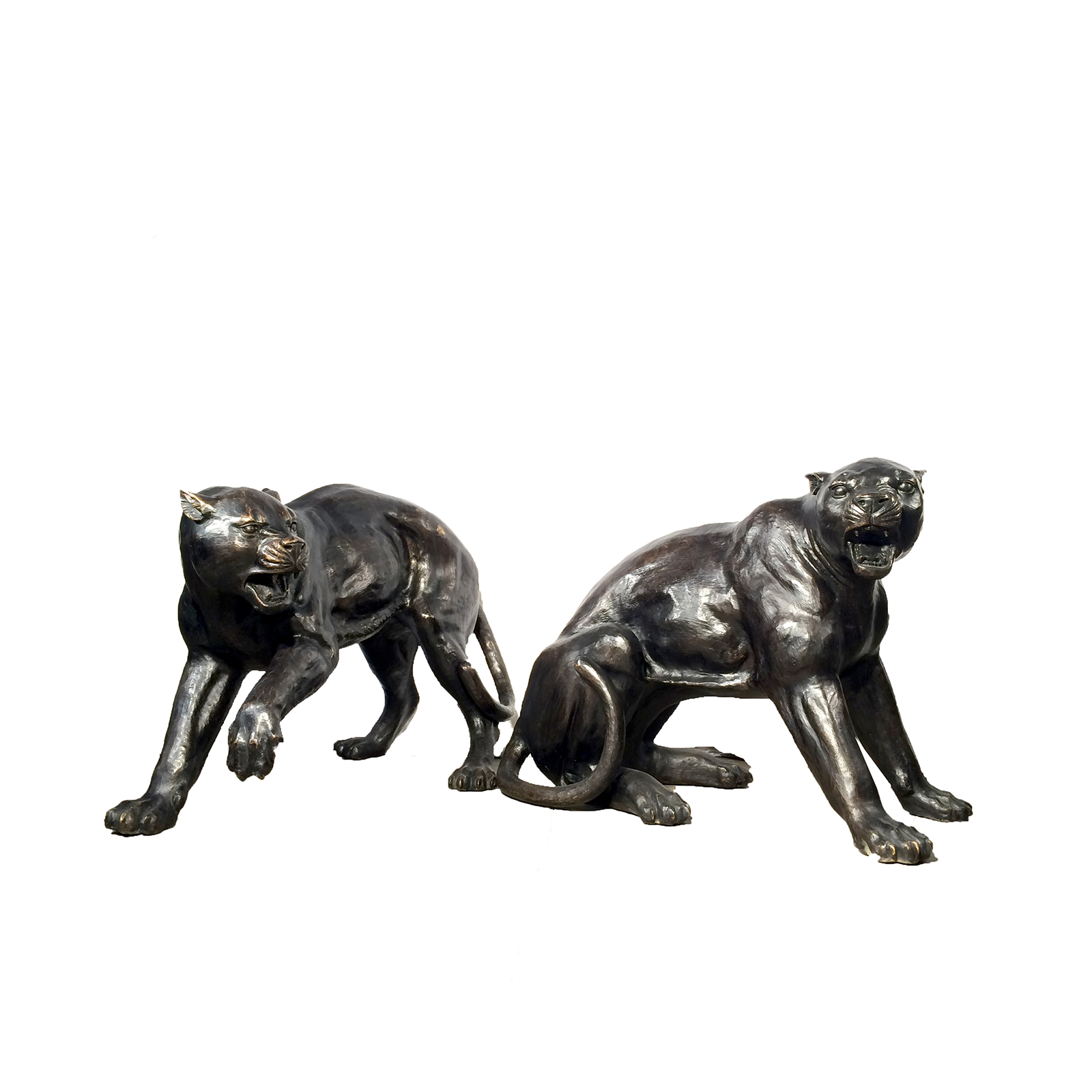 Our bronze sculpture selection may also be customized in a number of fire-applied patinas, such as classic French Brown, Verdigris, Italian Green as well as other custom finish options. All bronze statuary will develop a natural patina when left in natures elements. The aged patina on bronzes is often desired, but can be prevented by care and cleaning of the bronze statue by applying beeswax or other polish to prevent a patina from forming. Click here to view our Bronze Sculpture and Fountain Care and Cleaning Guide. Should you have questions about this Bronze Fighting Panthers Sculpture Set, please reach out to our corporate office and warehouse. 1-800-929-1681.