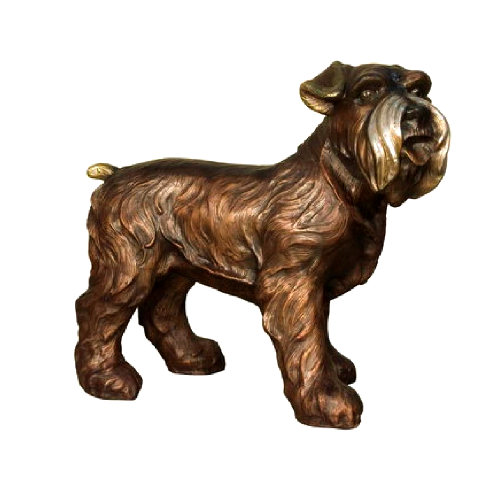 Our bronze sculpture and fountain selection may also be customized in a number of fire-applied patinas, such as classic French Brown, Verdigris, Italian Green as well as other custom finish options. All bronze statuary will develop a natural patina when left in natures elements. The aged patina on bronzes is often desired, but can be prevented by care and cleaning of the bronze statue by applying beeswax or other polish to prevent a patina from forming. Click here to view our Bronze Sculpture and Fountain Care and Cleaning Guide. Should you have questions about this Bronze Schnauzer Dog Sculpture , please reach out to our corporate office and warehouse. 1-800-929-1681.