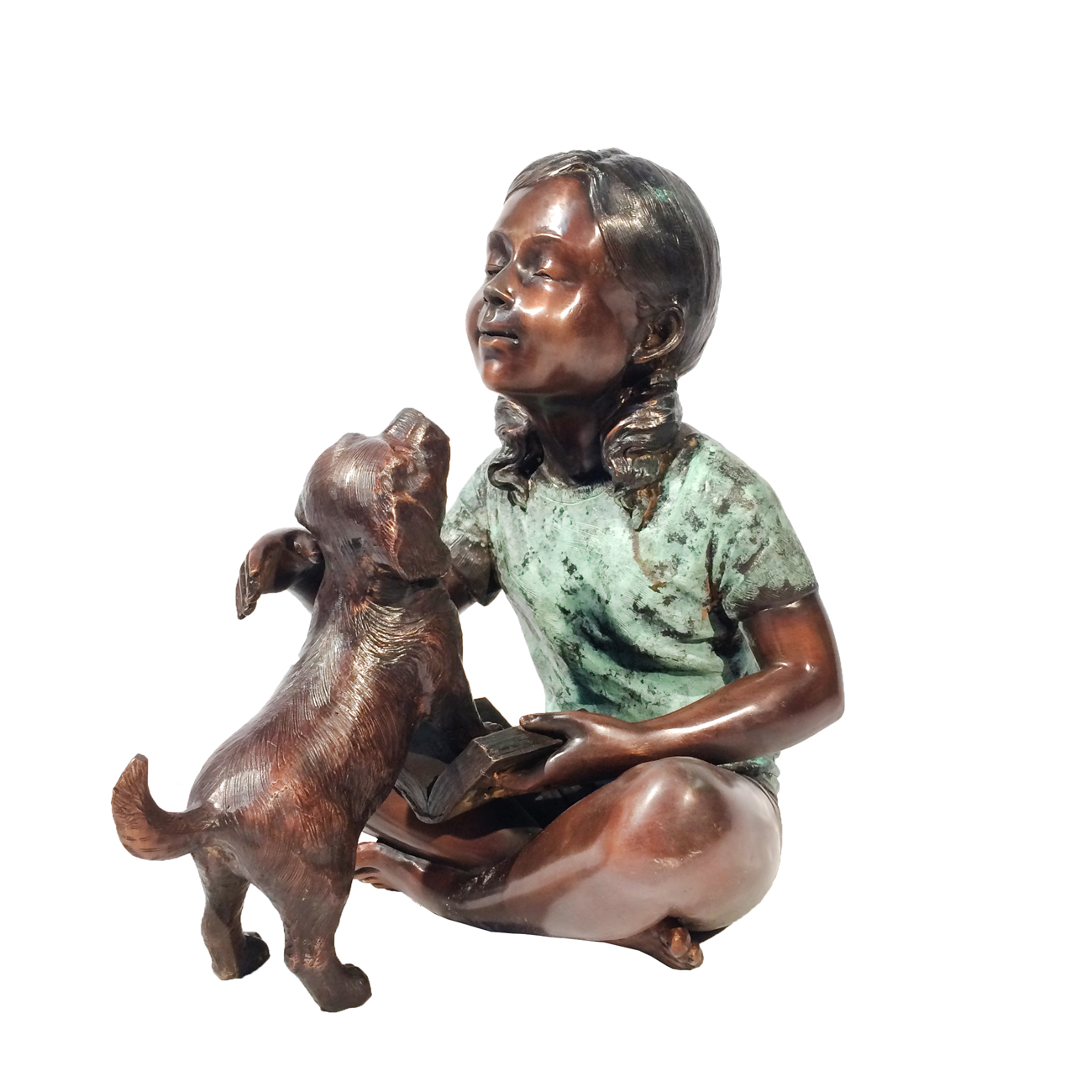 Our bronze sculpture selection may also be customized in a number of fire-applied patinas, such as classic French Brown, Verdigris, Italian Green as well as other custom finish options. All bronze statuary will develop a natural patina when left in natures elements. The aged patina on bronzes is often desired, but can be prevented by care and cleaning of the bronze statue by applying beeswax or other polish to prevent a patina from forming. Click here to view our Bronze Sculpture and Fountain Care and Cleaning Guide. Should you have questions about this Bronze Girl Sitting with Dog Sculpture, please reach out to our corporate office and warehouse. 1-800-929-1681.