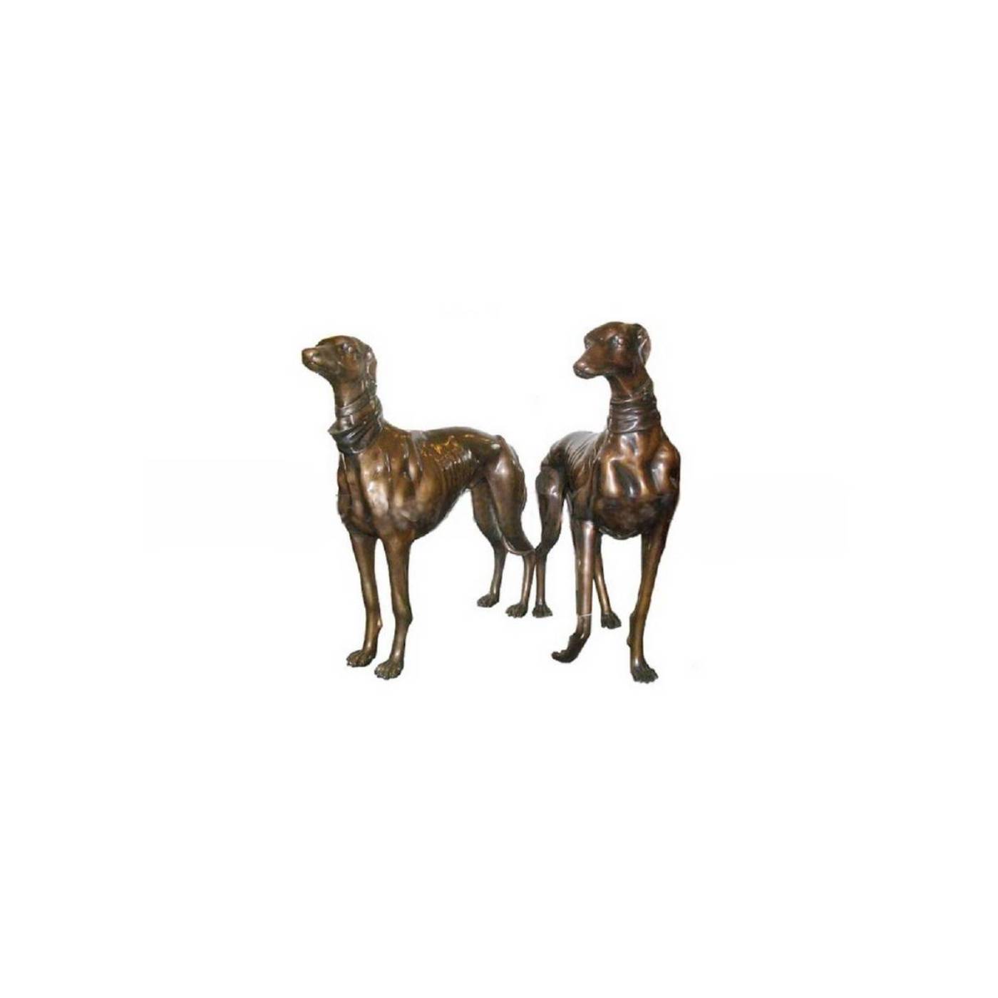 Our bronze sculpture selection may also be customized in a number of fire-applied patinas, such as classic French Brown, Verdigris, Italian Green as well as other custom finish options. All bronze statuary will develop a natural patina when left in natures elements. The aged patina on bronzes is often desired, but can be prevented by care and cleaning of the bronze statue by applying beeswax or other polish to prevent a patina from forming. Click here to view our Bronze Sculpture and Fountain Care and Cleaning Guide. Should you have questions about this Bronze Two Greyhounds Sculpture Set, please reach out to our corporate office and warehouse. 1-800-929-1681.