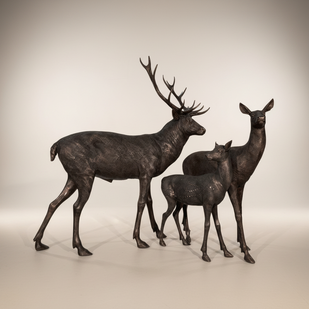 Our bronze sculpture selection may also be customized in a number of fire-applied patinas, such as classic French Brown, Verdigris, Italian Green as well as other custom finish options. All bronze statuary will develop a natural patina when left in natures elements. The aged patina on bronzes is often desired, but can be prevented by care and cleaning of the bronze statue by applying beeswax or other polish to prevent a patina from forming. Click here to view our Bronze Sculpture and Fountain Care and Cleaning Guide. Should you have questions about this Bronze Deer Family of Three Sculpture Set, please reach out to our corporate office and warehouse. 1-800-929-1681.