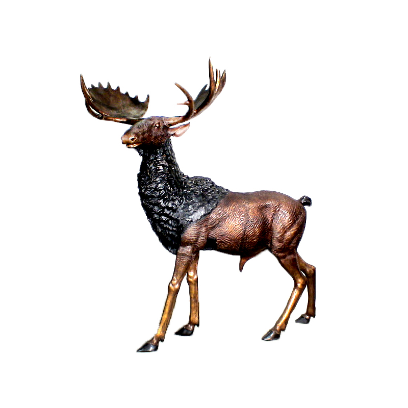 Our bronze sculpture and fountain selection may also be customized in a number of fire-applied patinas, such as classic French Brown, Verdigris, Italian Green as well as other custom finish options. All bronze statuary will develop a natural patina when left in natures elements. The aged patina on bronzes is often desired, but can be prevented by care and cleaning of the bronze statue by applying beeswax or other polish to prevent a patina from forming. Click here to view our Bronze Sculpture and Fountain Care and Cleaning Guide. Should you have questions about this Bronze Large Moose Sculpture, please reach out to our corporate office and warehouse. 1-800-929-1681.