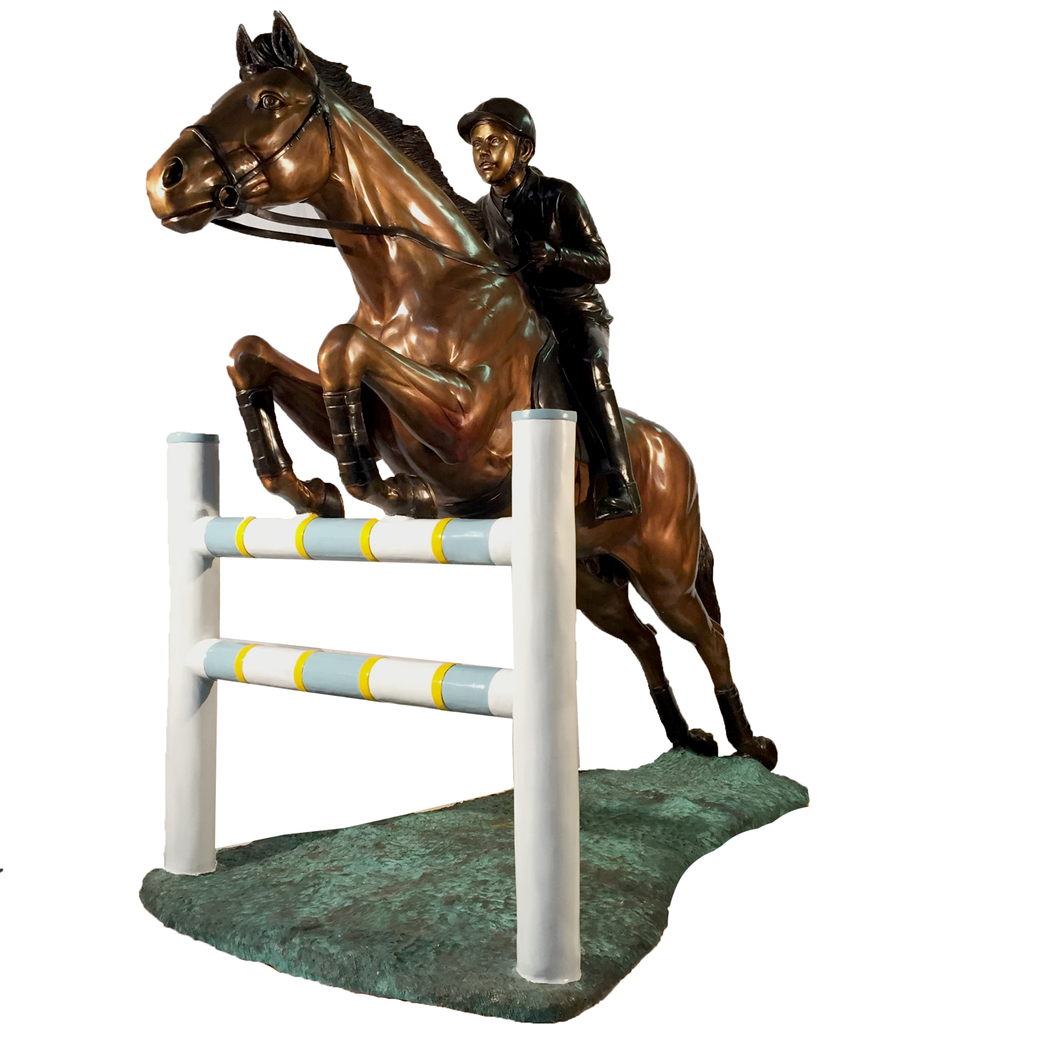 Our bronze sculpture selection may also be customized in a number of fire-applied patinas, such as classic French Brown, Verdigris, Italian Green as well as other custom finish options. All bronze statuary will develop a natural patina when left in natures elements. The aged patina on bronzes is often desired, but can be prevented by care and cleaning of the bronze statue by applying beeswax or other polish to prevent a patina from forming. Click here to view our Bronze Sculpture and Fountain Care and Cleaning Guide. Should you have questions about this Bronze Jockey Girl on Horse Jumping Sculpture, please reach out to our corporate office and warehouse. 1-800-929-1681.