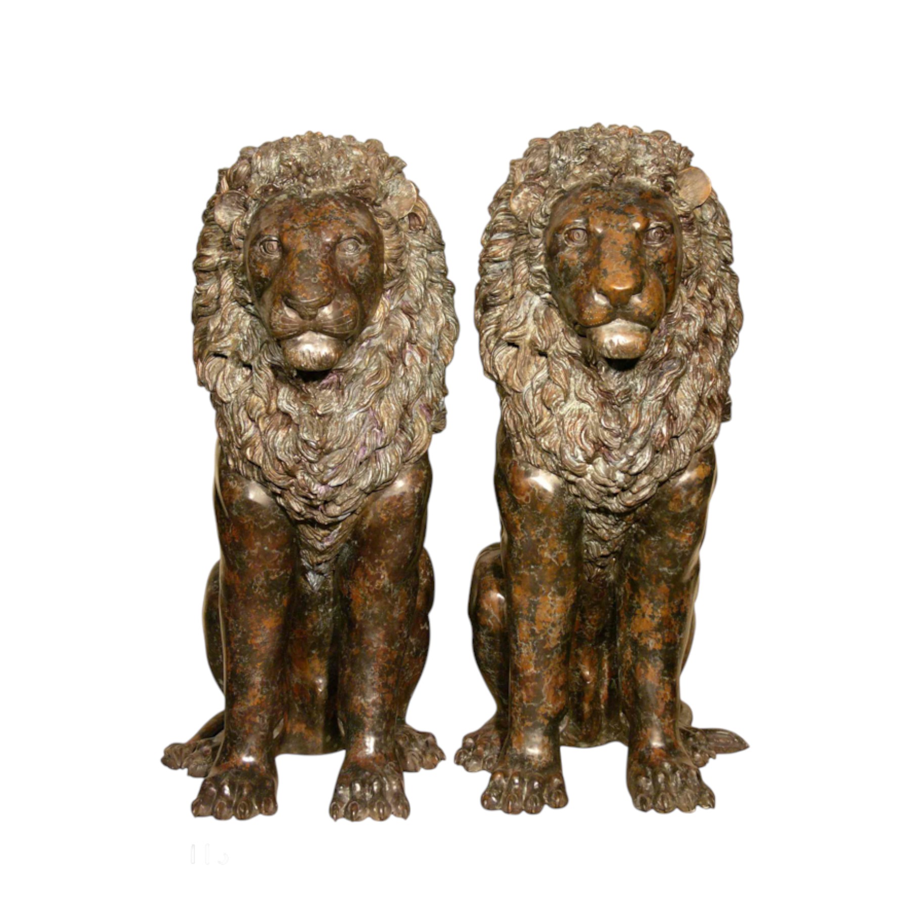 Our bronze sculpture selection may also be customized in a number of fire-applied patinas, such as classic French Brown, Verdigris, Italian Green as well as other custom finish options. All bronze statuary will develop a natural patina when left in natures elements. The aged patina on bronzes is often desired, but can be prevented by care and cleaning of the bronze statue by applying beeswax or other polish to prevent a patina from forming. Click here to view our Bronze Sculpture and Fountain Care and Cleaning Guide. Should you have questions about this Bronze Sitting Lions Sculpture Set, please reach out to our corporate office and warehouse. 1-800-929-1681.