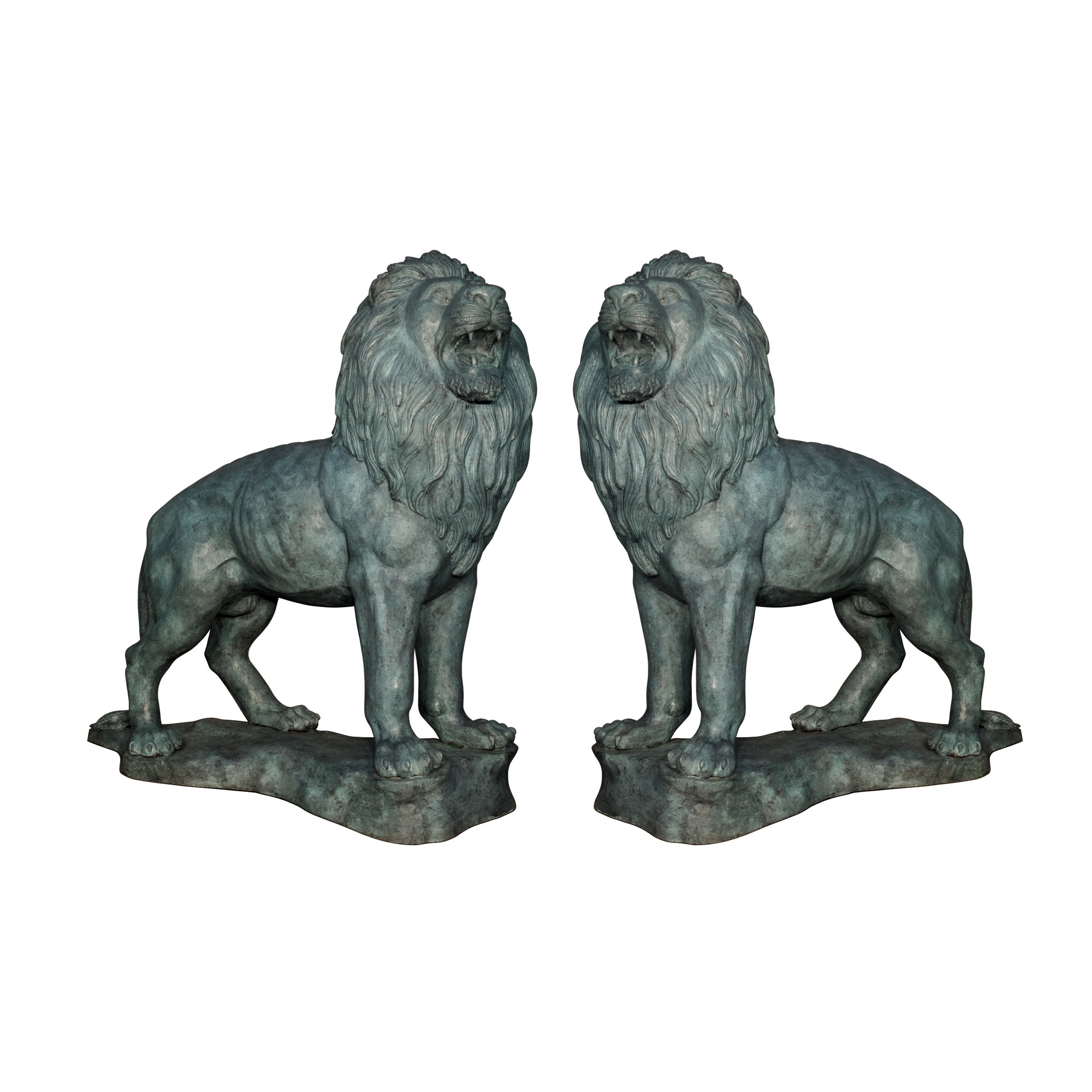 Bronze Standing Lions atop Base Sculpture Pair by Metropolitan Galleries was cast by the traditional, Lost Wax Bronze Casting method. This labor intensive and time consuming method of casting bronze statues, ensure pristine quality and vivid detail. Metropolitan Galleries Inc. Offers a large selection of bronze statues and bronze fountains perfect for indoor and outdoor use. This Bronze Standing Lions atop Base Sculpture Pair features intricate, hand forged details with a beautiful verdigris, fire-applied patina. We proudly ship to all fifty states, as well as international shipping.