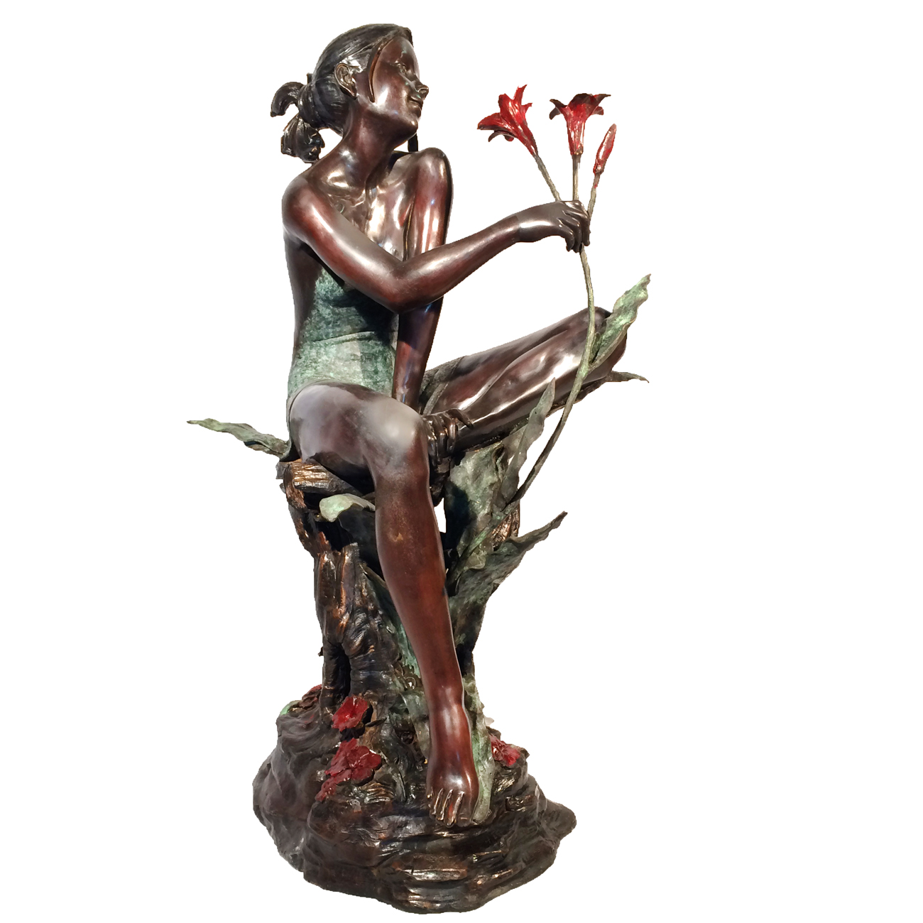 Our bronze sculpture selection may also be customized in a number of fire-applied patinas, such as classic French Brown, Verdigris, Italian Green as well as other custom finish options. All bronze statuary will develop a natural patina when left in natures elements. The aged patina on bronzes is often desired, but can be prevented by care and cleaning of the bronze statue by applying beeswax or other polish to prevent a patina from forming. Click here to view our Bronze Sculpture and Fountain Care and Cleaning Guide. Should you have questions about this Bronze Flower Girl sitting on Rock Sculpture, please reach out to our corporate office and warehouse. 1-800-929-1681.