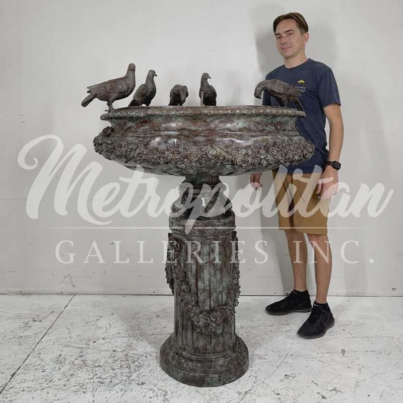 Bronze Classical Birdbath Fountain Sculpture by Metropolitan Galleries was cast by the traditional, Lost Wax Bronze Casting method. This labor intensive and time consuming method of casting bronze statues, ensure pristine quality and vivid detail. Metropolitan Galleries Inc. Offers a large selection of bronze statues and bronze fountains perfect for indoor and outdoor use. This Bronze Classical Birdbath Fountain Sculpture features intricate, hand forged details with a beautiful verdigris fire-applied patina. We proudly ship to all fifty states, as well as international shipping.