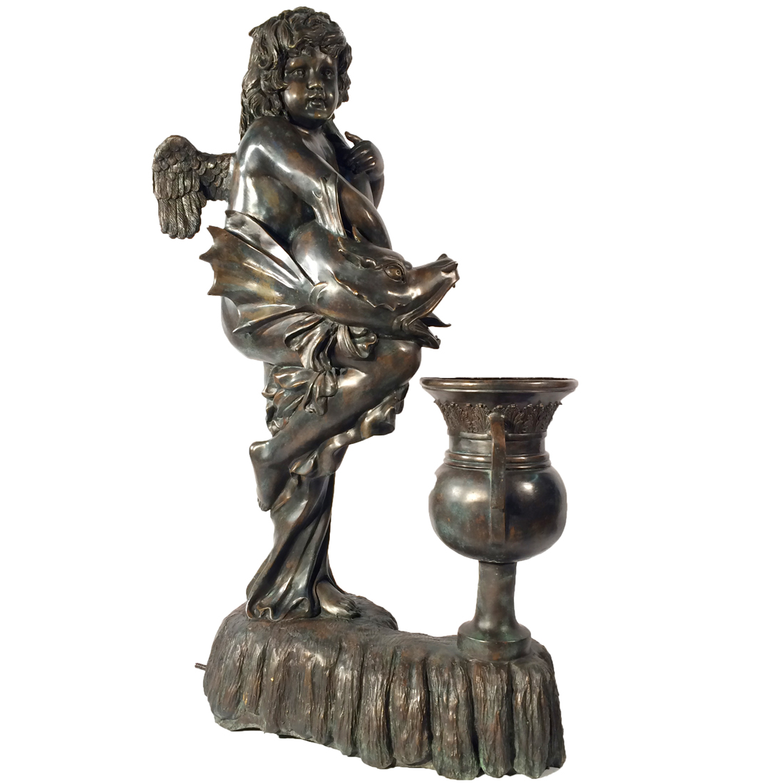 Our bronze sculpture selection may also be customized in a number of fire-applied patinas, such as classic French Brown, Verdigris, Italian Green as well as other custom finish options. All bronze statuary will develop a natural patina when left in natures elements. The aged patina on bronzes is often desired, but can be prevented by care and cleaning of the bronze statue by applying beeswax or other polish to prevent a patina from forming. Click here to view our Bronze Sculpture and Fountain Care and Cleaning Guide. Should you have questions about this Bronze Cupid with Fish Fountain Sculpture, please reach out to our corporate office and warehouse. 1-800-929-1681.