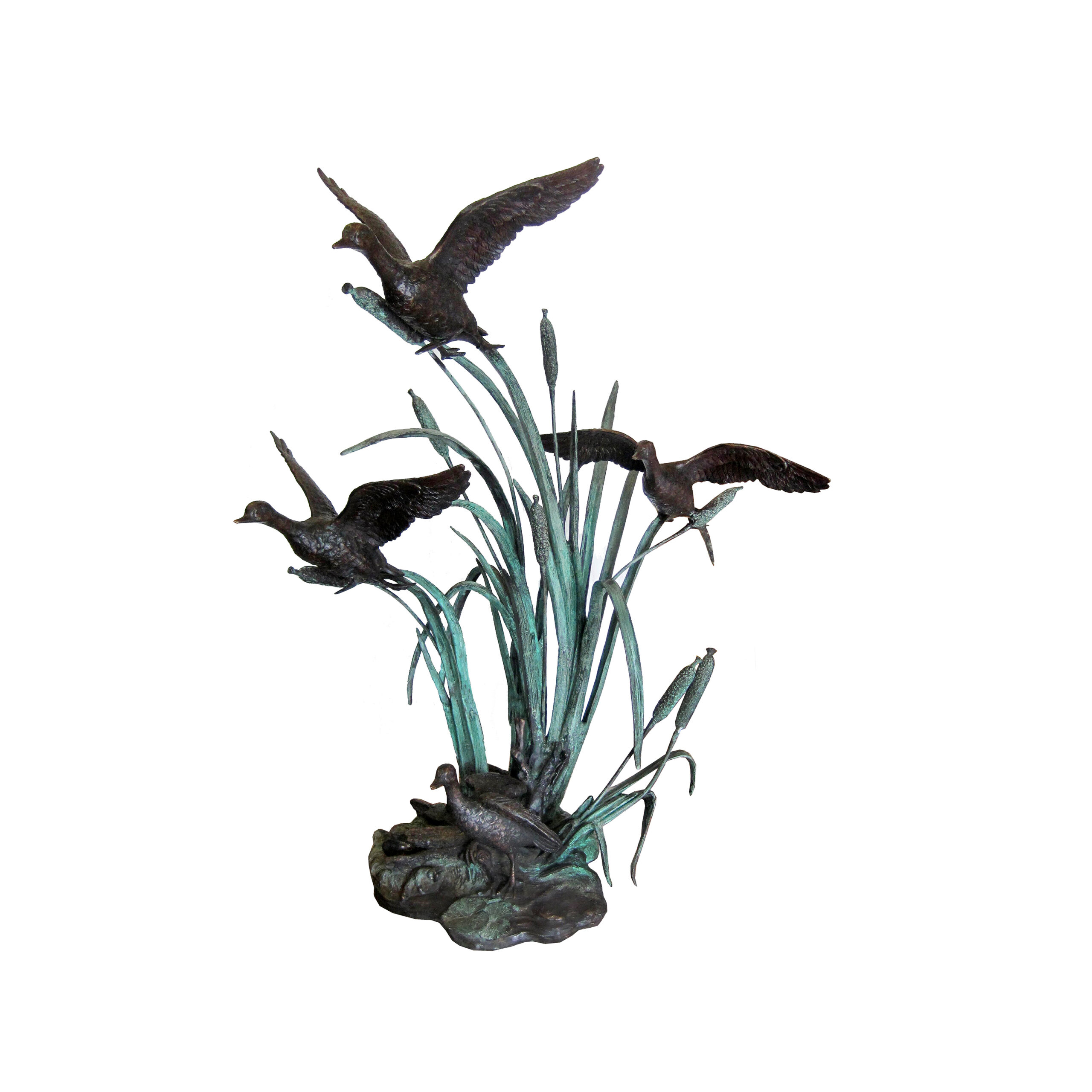 Bronze Four Ducks in Reeds Fountain Sculpture by Metropolitan Galleries was cast by the traditional, Lost Wax Bronze Casting method. This labor intensive and time consuming method of casting bronze statues, ensure pristine quality and vivid detail. Metropolitan Galleries Inc. Offers a large selection of bronze statues and bronze fountains perfect for indoor and outdoor use. This Bronze Four Ducks in Reeds Fountain Sculpture features intricate, hand forged details with a beautiful brown and green fire-applied patina. We proudly ship to all fifty states, as well as international shipping.
