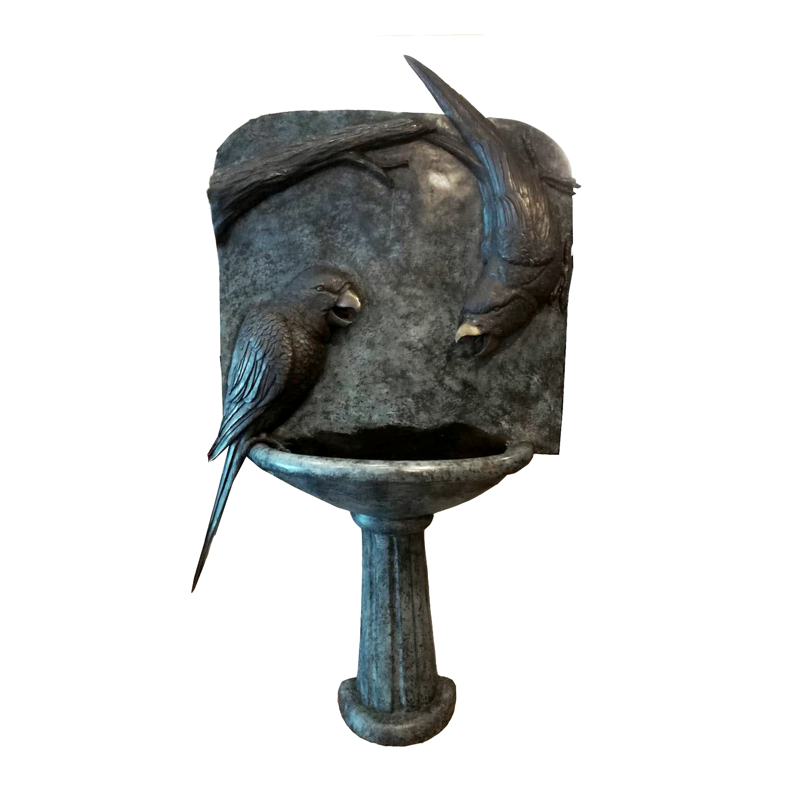 Our bronze sculpture selection may also be customized in a number of fire-applied patinas, such as classic French Brown, Verdigris, Italian Green as well as other custom finish options. All bronze statuary will develop a natural patina when left in natures elements. The aged patina on bronzes is often desired, but can be prevented by care and cleaning of the bronze statue by applying beeswax or other polish to prevent a patina from forming. Click here to view our Bronze Sculpture and Fountain Care and Cleaning Guide. Should you have questions about this Bronze Parrots Wall Fountain Sculpture, please reach out to our corporate office and warehouse. 1-800-929-1681.