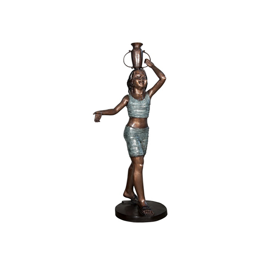 Our bronze sculpture selection may also be customized in a number of fire-applied patinas, such as classic French Brown, Verdigris, Italian Green as well as other custom finish options. All bronze statuary will develop a natural patina when left in natures elements. The aged patina on bronzes is often desired, but can be prevented by care and cleaning of the bronze statue by applying beeswax or other polish to prevent a patina from forming. Click here to view our Bronze Sculpture and Fountain Care and Cleaning Guide. Should you have questions about this Bronze Girl balancing Jar Fountain Sculpture, please reach out to our corporate office and warehouse. 1-800-929-1681.