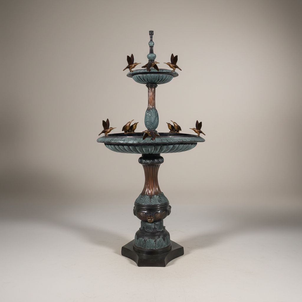 Our bronze sculpture selection may also be customized in a number of fire-applied patinas, such as classic French Brown, Verdigris, Italian Green as well as other custom finish options. All bronze statuary will develop a natural patina when left in natures elements. The aged patina on bronzes is often desired, but can be prevented by care and cleaning of the bronze statue by applying beeswax or other polish to prevent a patina from forming. Click here to view our Bronze Sculpture and Fountain Care and Cleaning Guide. Should you have questions about this Bronze Two Tier Doves Fountain, please reach out to our corporate office and warehouse. 1-800-929-1681.