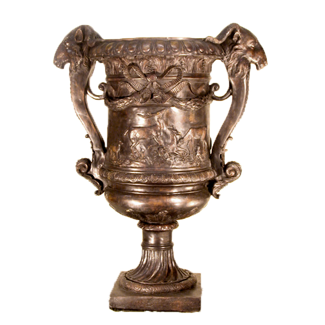 Our bronze sculpture selection may also be customized in a number of fire-applied patinas, such as classic French Brown, Verdigris, Italian Green as well as other custom finish options. All bronze statuary will develop a natural patina when left in natures elements. The aged patina on bronzes is often desired, but can be prevented by care and cleaning of the bronze statue by applying beeswax or other polish to prevent a patina from forming. Click here to view our Bronze Sculpture and Fountain Care and Cleaning Guide. Should you have questions about this Bronze Goat Head Urn, please reach out to our corporate office and warehouse. 1-800-929-1681.