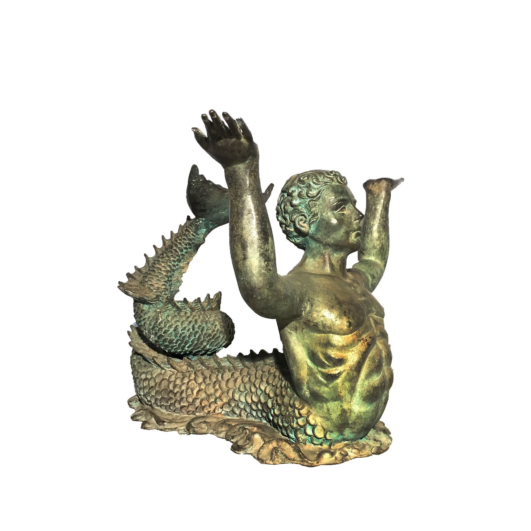 Our bronze sculpture selection may also be customized in a number of fire-applied patinas, such as classic French Brown, Verdigris, Antique Green as well as other custom finish options. All bronze statuary will develop a natural patina when left in natures elements. The aged patina on bronzes is often desired, but can be prevented by care and cleaning of the bronze statue by applying beeswax or other polish to prevent a patina from forming. Click here to view our Bronze Sculpture and Fountain Care and Cleaning Guide. Should you have questions about this Bronze Merman Table Base Sculpture, please reach out to our corporate office and warehouse. 1-800-929-1681.