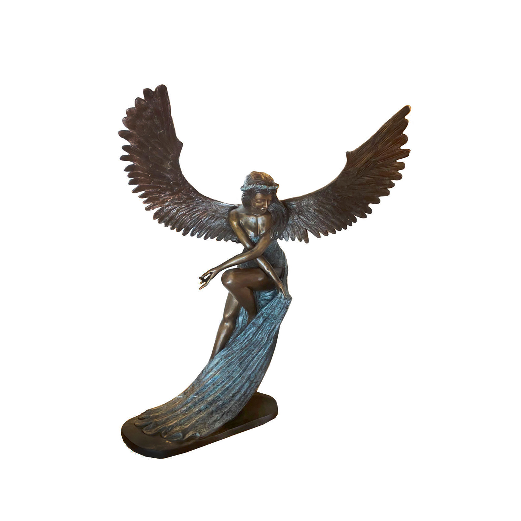 Our bronze sculpture selection may also be customized in a number of fire-applied patinas, such as classic French Brown, Verdigris, Italian Green as well as other custom finish options. All bronze statuary will develop a natural patina when left in natures elements. The aged patina on bronzes is often desired, but can be prevented by care and cleaning of the bronze statue by applying beeswax or other polish to prevent a patina from forming. Click here to view our Bronze Sculpture and Fountain Care and Cleaning Guide. Should you have questions about this Bronze Winged Goddess Sculpture, please reach out to our corporate office and warehouse. 1-800-929-1681.