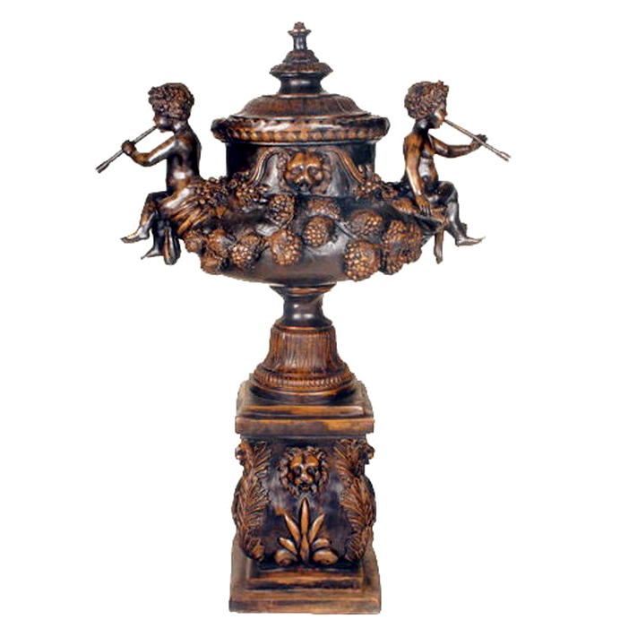 Our bronze sculpture selection may also be customized in a number of fire-applied patinas, such as classic French Brown, Verdigris, Italian Green as well as other custom finish options. All bronze statuary will develop a natural patina when left in natures elements. The aged patina on bronzes is often desired, but can be prevented by care and cleaning of the bronze statue by applying beeswax or other polish to prevent a patina from forming. Click here to view our Bronze Sculpture and Fountain Care and Cleaning Guide. Should you have questions about this Bronze Boys with Flutes Fountain Urn, please reach out to our corporate office and warehouse. 1-800-929-1681.