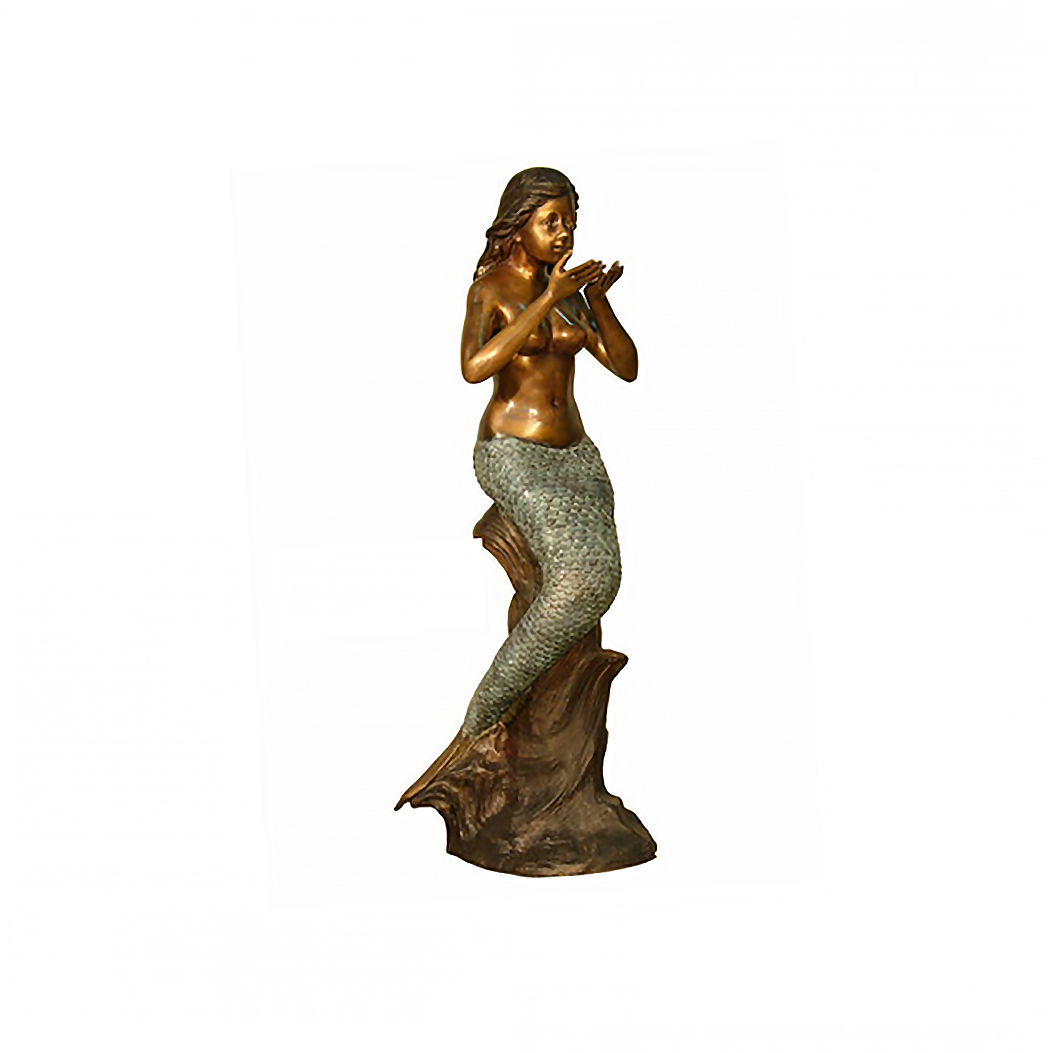 Our bronze sculpture selection may also be customized in a number of fire-applied patinas, such as classic French Brown, Verdigris, Italian Green as well as other custom finish options. All bronze statuary will develop a natural patina when left in natures elements. The aged patina on bronzes is often desired, but can be prevented by care and cleaning of the bronze statue by applying beeswax or other polish to prevent a patina from forming. Click here to view our Bronze Sculpture and Fountain Care and Cleaning Guide. Should you have questions about this Bronze Mermaid holding Hands Out Sculpture, please reach out to our corporate office and warehouse. 1-800-929-1681.