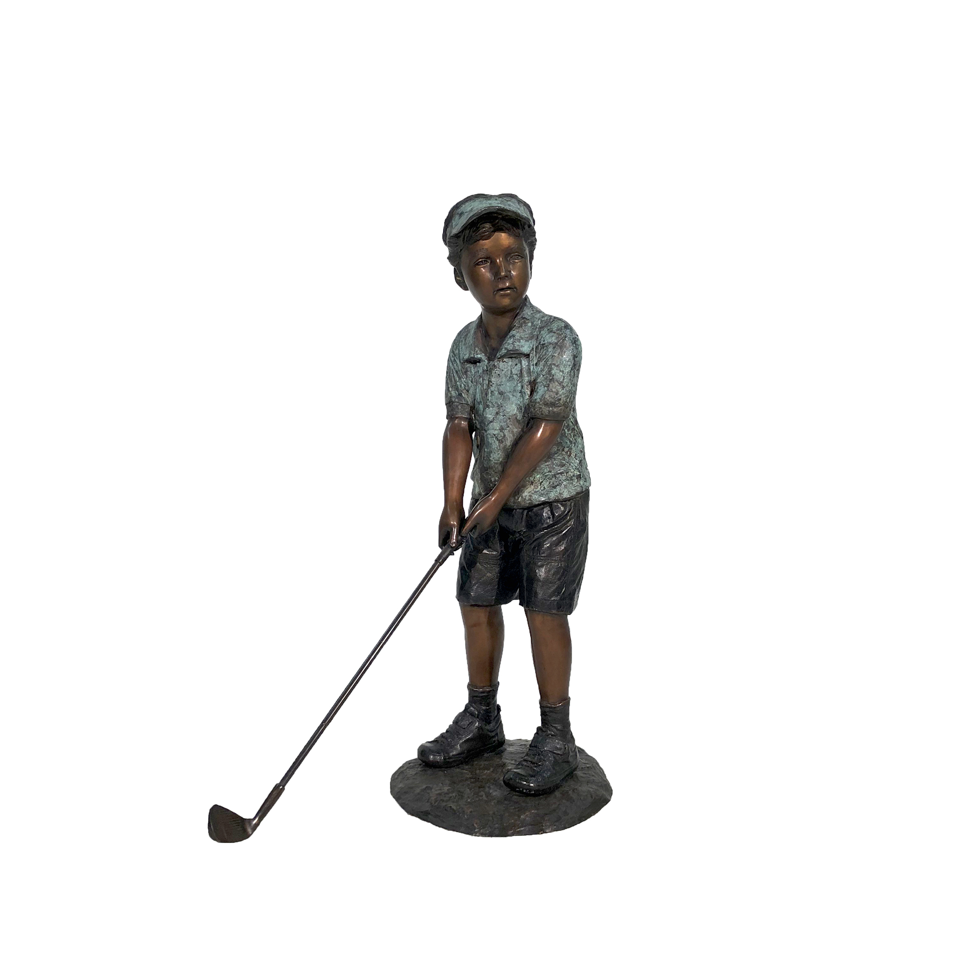 Our bronze sculpture selection may also be customized in a number of fire-applied patinas, such as classic French Brown, Verdigris, Italian Green as well as other custom finish options. All bronze statuary will develop a natural patina when left in natures elements. The aged patina on bronzes is often desired, but can be prevented by care and cleaning of the bronze statue by applying beeswax or other polish to prevent a patina from forming. Click here to view our Bronze Sculpture and Fountain Care and Cleaning Guide. Should you have questions about this Bronze Little Boy Golfer Sculpture, please reach out to our corporate office and warehouse. 1-800-929-1681.