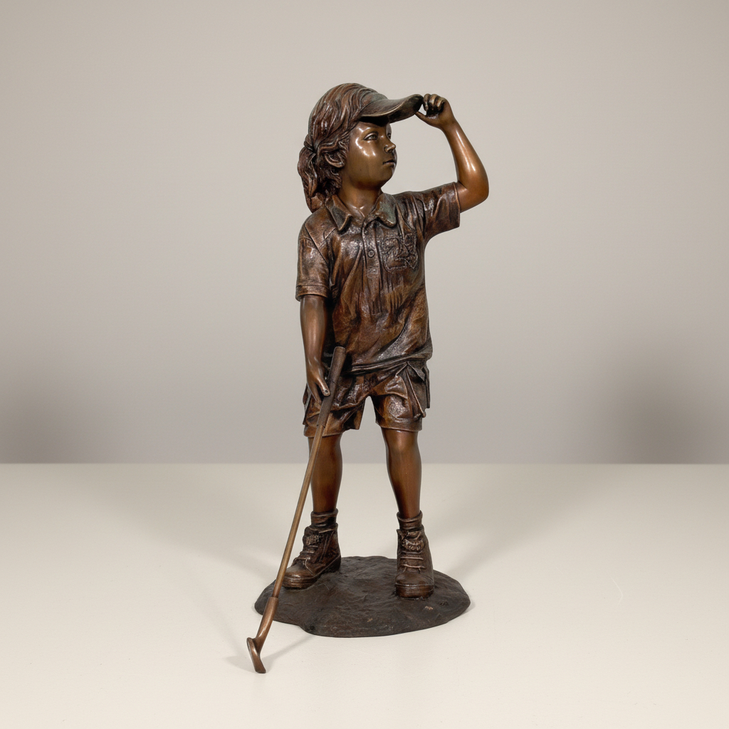 Our bronze sculpture selection may also be customized in a number of fire-applied patinas, such as classic French Brown, Verdigris, Italian Green as well as other custom finish options. All bronze statuary will develop a natural patina when left in natures elements. The aged patina on bronzes is often desired, but can be prevented by care and cleaning of the bronze statue by applying beeswax or other polish to prevent a patina from forming. Click here to view our Bronze Sculpture and Fountain Care and Cleaning Guide. Should you have questions about this Bronze Little Girl Golfer Sculpture, please reach out to our corporate office and warehouse. 1-800-929-1681.