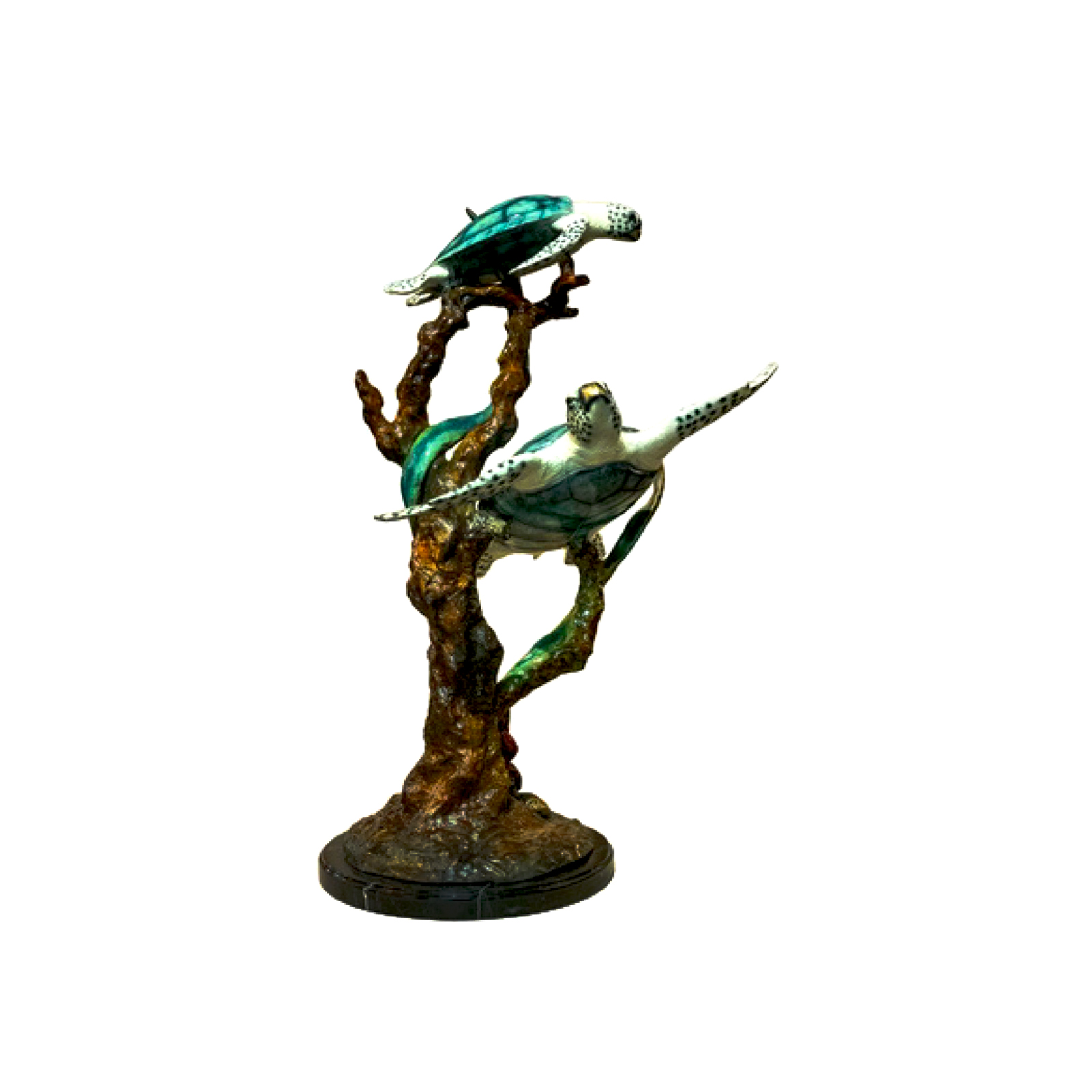 Bronze Two Sea Turtles Sculpture with Color Finish on Marble Base by Metropolitan Galleries was cast by the traditional, Lost Wax Bronze Casting method. This labor intensive and time consuming method of casting bronze statues, ensure pristine quality and vivid detail. Metropolitan Galleries Inc. Offers a large selection of bronze statues and bronze fountains perfect for indoor and outdoor use. This Bronze Two Sea Turtles Sculpture on Marble Base features intricate, hand forged details with a brown and green, fire-applied patina. We proudly ship to all fifty states, as well as international shipping.