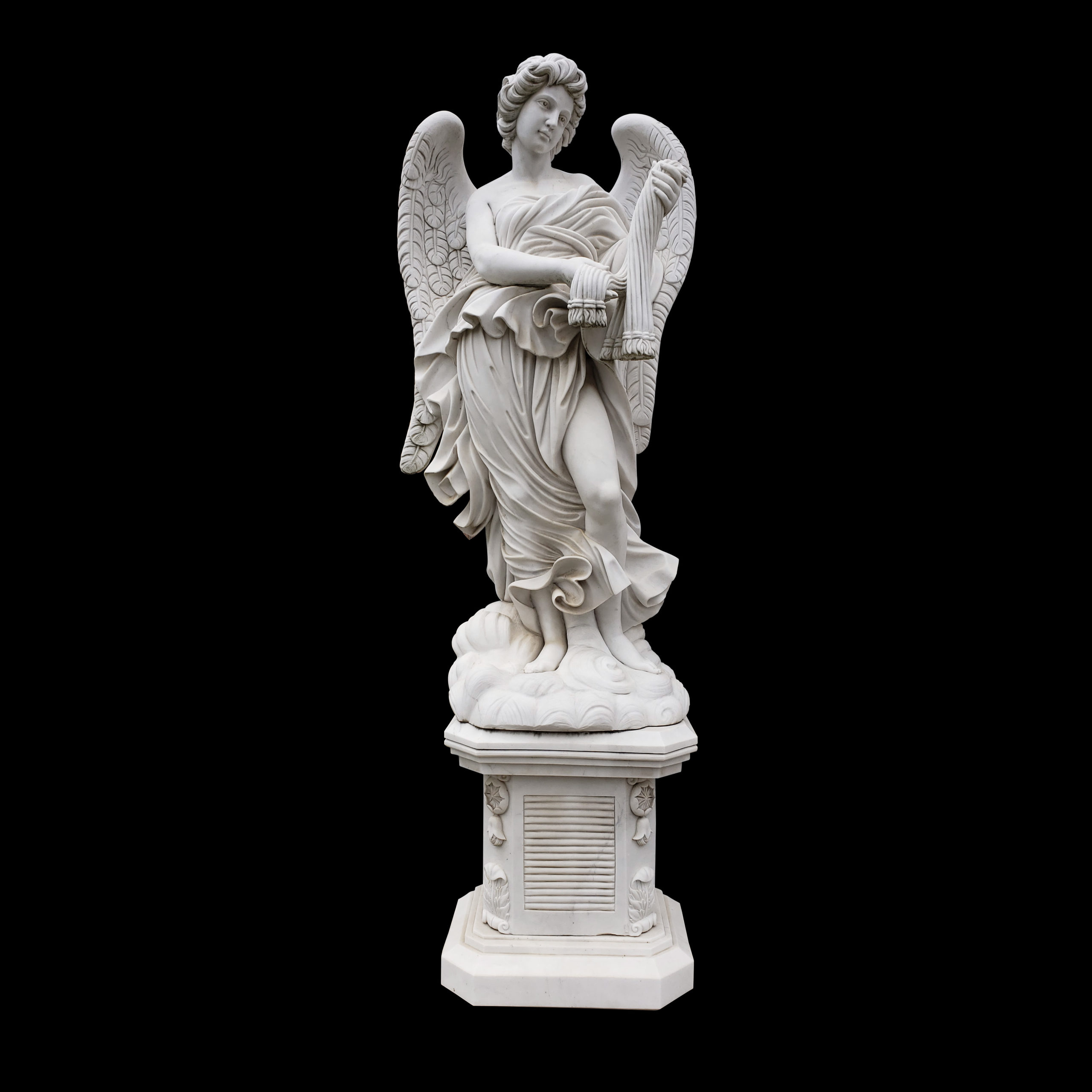 Marble Saint Angelos Angel Sculpture atop Base by Metropolitan Galleries was carved by skilled marble sculptors from a solid piece of high quality marble stone. Marble sculpture is the art of creating three-dimensional forms from a solid piece of stone. This Marble Saint Angelos Angel Sculpture atop Base has amazing hand-carved detail and can be customized in size and style of marble to fit indoor and outdoor design applications. Marble sculpting is considered to be one of the oldest forms of art development. Metropolitan Galleries offers a diverse collection of carved marble sculpture, as well as custom marble sculpture design and development capabilities.